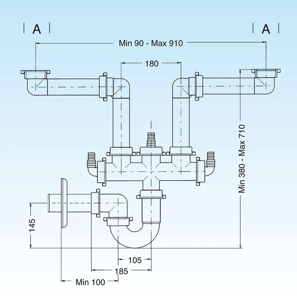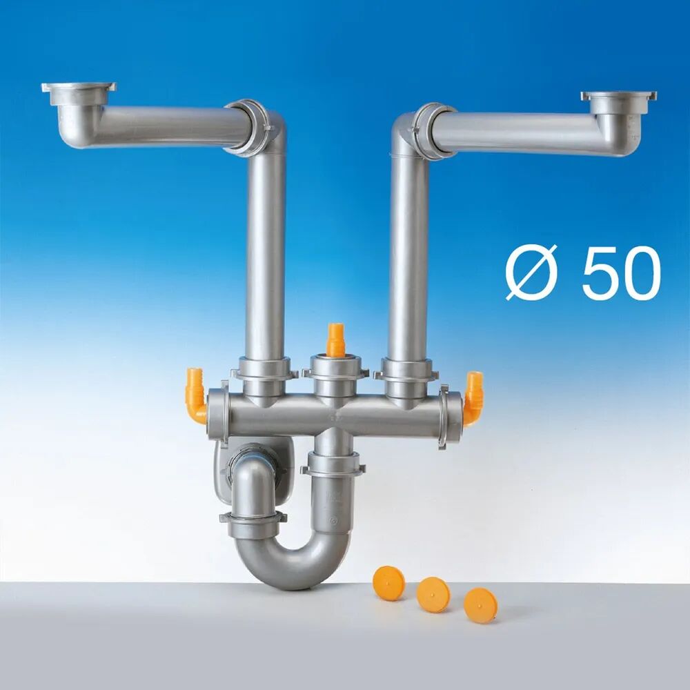 - Сифон предназначен для подключения кухонных моек, имеющих две раковины, к канализационной системе, для чего на данном сифоне присутствует двойной разборный выпуск