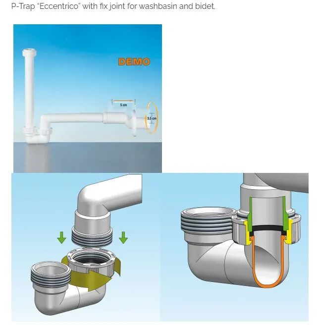 - Сифон P-Trap «Eccentrico» с фиксированным соединением для умывальника или биде