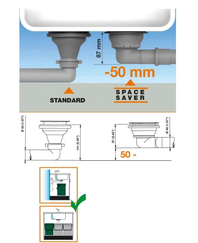- Слив для моек из нержавеющей стали, синтетических материалов и керамики со сливным отверстием Ø 90