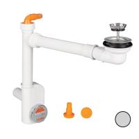 - Компактный сифон для моек с одной чашей. Конструкция сифона позволяет организовать отвод воды так, что обеспечивает экономию места внутри корпуса под мойкой