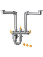 - Сифон предназначен для подключения кухонных моек, имеющих две раковины, к канализационной системе, для чего на данном сифоне присутствует двойной разборный выпуск