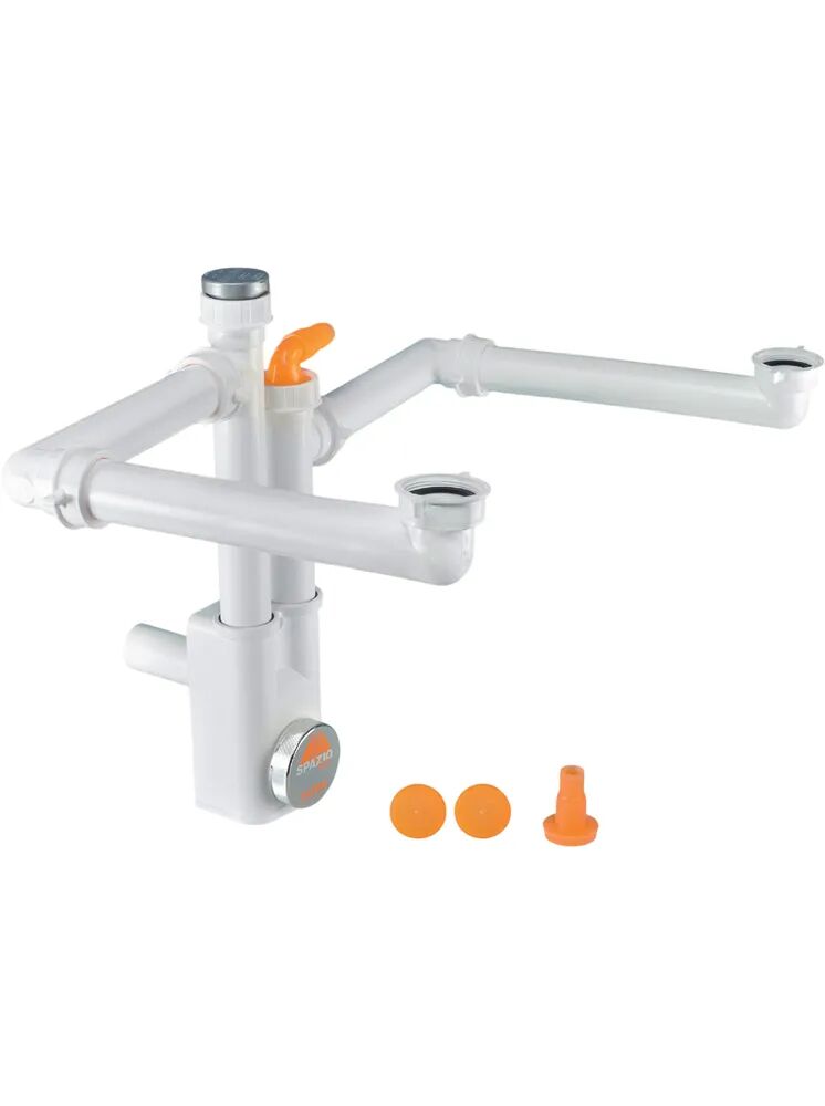 - Сифон предназначен для подключения кухонных моек, имеющих две раковины, к канализационной системе, для чего на данном сифоне присутствует двойной разборный выпуск